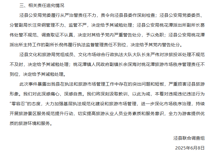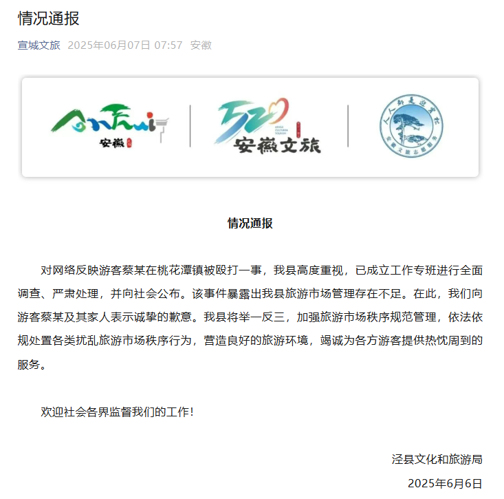 6月7日0時許,涇縣文化和旅游局發(fā)布情況通報稱,已成立工作專班進(jìn)行全面調(diào)查,向游客蔡某及其家人致歉。但輿論怒火并未完全平息,不少網(wǎng)民表示不能僅讓文旅部門“背鍋”,當(dāng)?shù)毓矙C(jī)關(guān)應(yīng)深入調(diào)查、嚴(yán)肅問責(zé)。據(jù)微信公眾號“涇縣人民政府發(fā)布”7日晚消息,涇縣召開全縣旅游市場秩序整治工作會議,會議要求“聚焦短板弱項(xiàng),抓好旅游市場秩序整治”等。