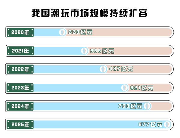 潮玩市場規(guī)模持續(xù)擴張奠定基礎(chǔ)。據(jù)《2025-2030年中國潮流玩具深度分析及發(fā)展前景研究預測報告》數(shù)據(jù)顯示,2020-2024年中國潮流玩具市場規(guī)模已經(jīng)從229億元攀升至763億元,且預計2025年突破877億元。潮玩市場擴容,大批消費者持續(xù)涌入,為培育LABUBU這樣的優(yōu)質(zhì)IP提供了肥沃的土壤。