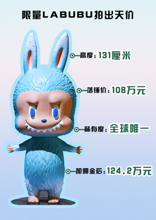 2025年6月10日,一件高131厘米的薄荷色初代LABUBU,以108萬元的價格落槌成交,創(chuàng)造了最貴LABUBU記錄。