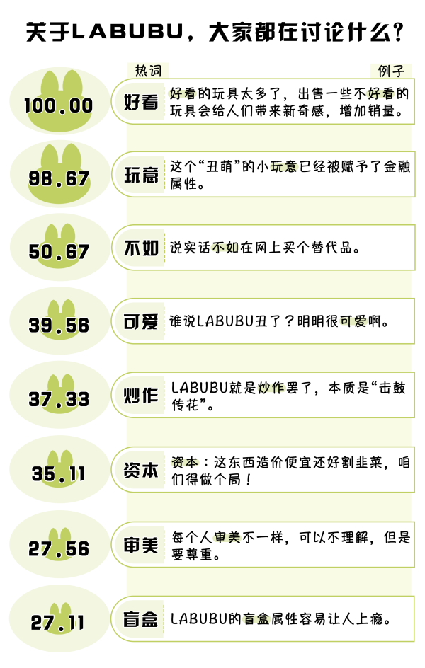 (數(shù)據(jù)來源:選取嗶哩嗶哩視頻《“丑東西”LABUBU,憑什么能讓全球富婆們上癮?》下的2976條一級評論及彈幕,做分詞及歸一化處理,進行分詞后將熱度最高的詞語規(guī)定為100)