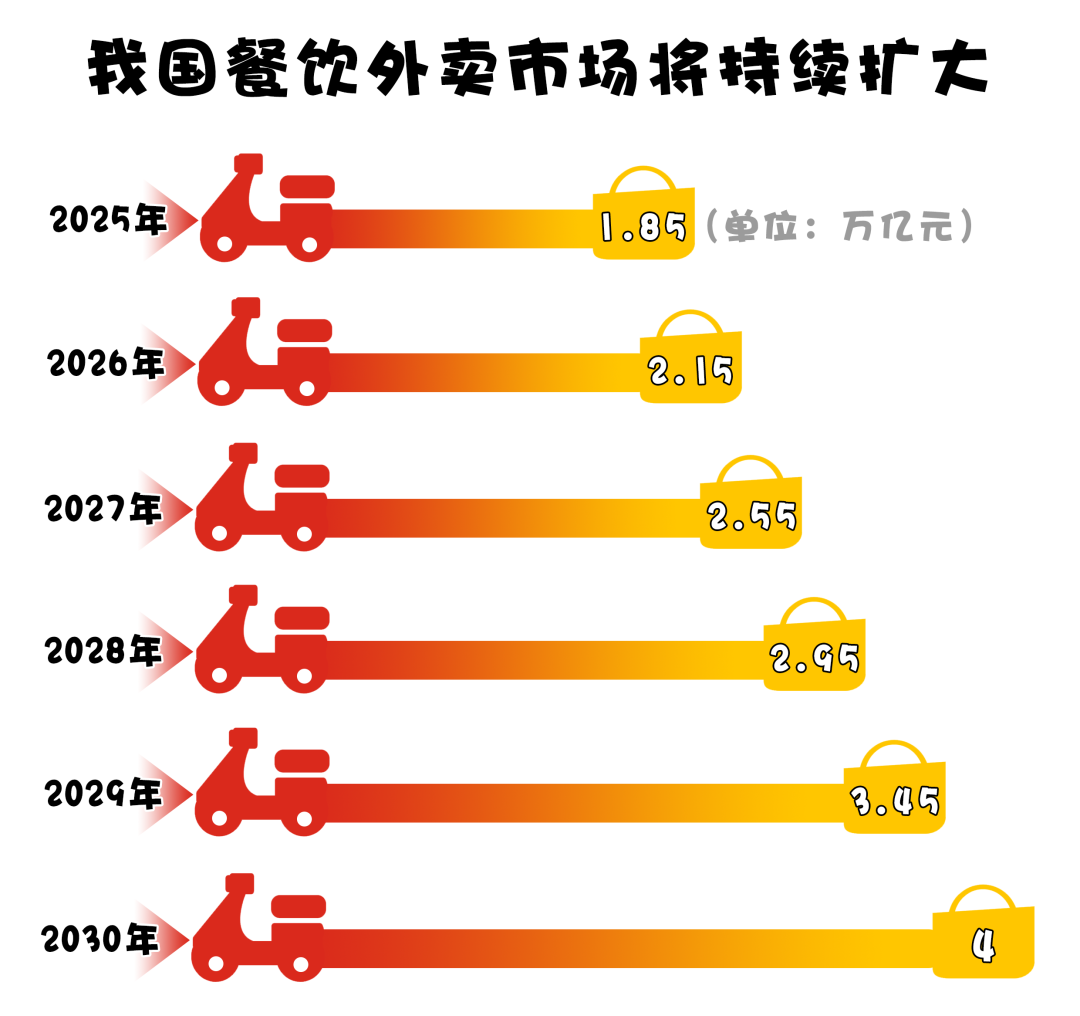 以外賣市場中的餐飲業(yè)為例,數(shù)據(jù)顯示,未來幾年,預(yù)計我國餐飲外賣市場規(guī)模將顯著增長,將從2025年的1.85萬億元一路攀升至2030年的4萬億元。這一持續(xù)拓寬的商業(yè)藍海,引得各家外賣平臺摩拳擦掌,“外賣大戰(zhàn)”不時打響。