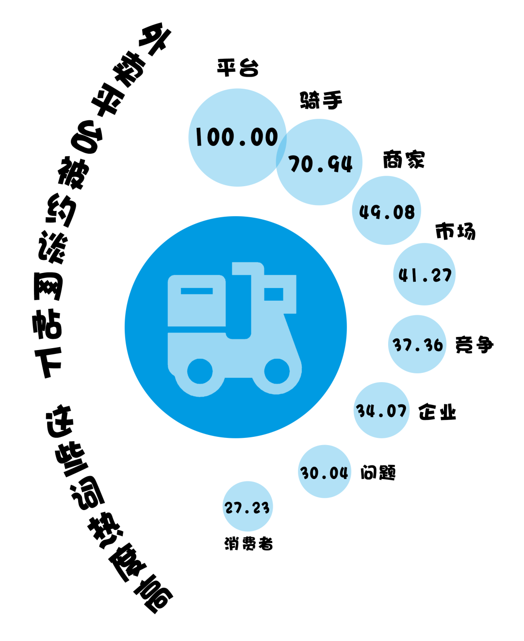 (數(shù)據(jù)來源:選取知乎話題“市場監(jiān)管總局等五部門約談京東、美團、餓了么等外賣平臺企業(yè),釋放了什么信號?”下的659個回答,做分詞及歸一化處理,進行分詞后將熱度最高的詞語規(guī)定為100)