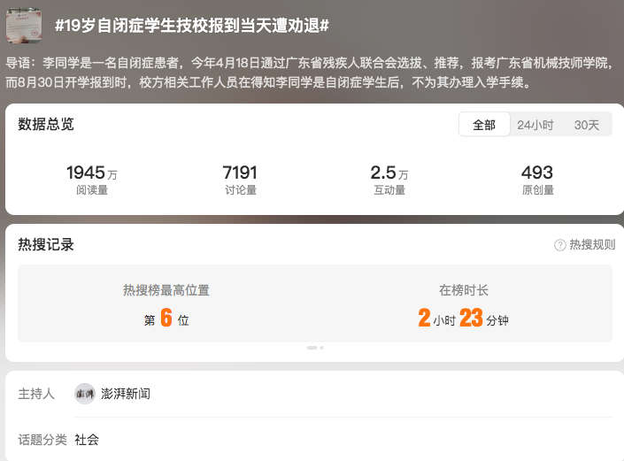 9月9日,澎湃新聞采訪相關(guān)方首發(fā)報(bào)道,當(dāng)事同學(xué)父親認(rèn)為,校方的審核、錄取程序存在諸多疏漏,直至入學(xué)報(bào)到當(dāng)天才說不予接收,讓學(xué)生錯(cuò)失了報(bào)讀其他學(xué)校的機(jī)會(huì)。廣東省機(jī)械技師學(xué)院宣傳部相關(guān)負(fù)責(zé)人回應(yīng)稱,學(xué)校確實(shí)向該同學(xué)發(fā)放錄取通知書,但該殘疾人招生項(xiàng)目主要面向肢體殘疾和言語殘疾學(xué)生,面試時(shí)校方教師對(duì)該同學(xué)患有自閉癥并不知情。因擔(dān)心對(duì)學(xué)校正常學(xué)生造成影響,建議其找其他合適的學(xué)校就讀。該報(bào)道發(fā)布后,齊魯晚報(bào)、上游新聞、極目新聞等媒體跟進(jìn)轉(zhuǎn)載,輿情開始發(fā)酵,#19歲自閉癥學(xué)生技校報(bào)到當(dāng)天遭勸退#微博話題登上熱搜榜第6位。