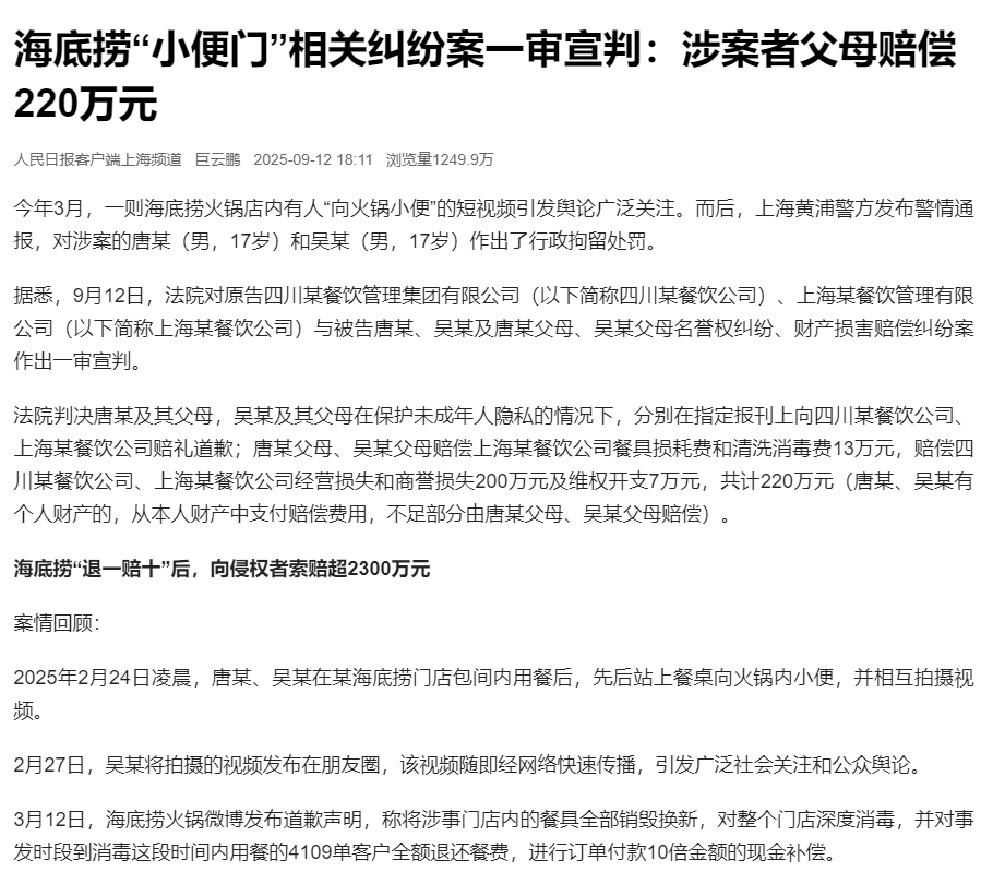 (海底撈“小便門”相關(guān)糾紛案一審判決結(jié)果 來源:人民日?qǐng)?bào)客戶端)