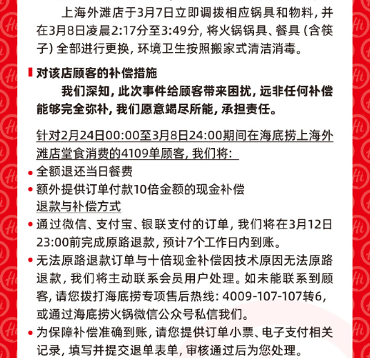(海底撈對(duì)消費(fèi)者“退一賠十”聲明截圖 來源:海底撈火鍋官方微博)