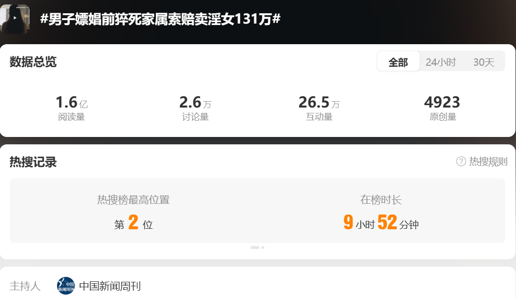此案被報道后,“@中國新聞周刊”、上觀新聞、封面新聞等媒體接力傳播,推高輿情熱度,微博話題“#男子嫖娼前猝死家屬索賠賣淫女131萬#”登上熱搜榜第2位。