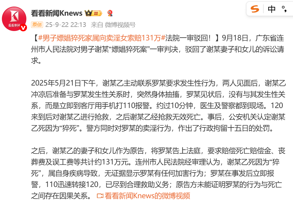 9月22日,據(jù)上海電視臺“@看看新聞Knews”消息,9月18日,廣東省連州市人民法院對男子謝某“嫖娼猝死案”作出一審判決。裁判文書網(wǎng)顯示,5月21日,謝某主動聯(lián)系羅某要求發(fā)生性行為,兩人見面后,謝某沖涼后準(zhǔn)備發(fā)生性關(guān)系時突然身體抽搐,羅某見狀后,立即到客廳撥打110報警。醫(yī)護(hù)人員趕到后對謝某進(jìn)行搶救,謝某經(jīng)搶救無效死亡。警方認(rèn)定謝某死因為“猝死”,對羅某的賣淫行為,作出行政拘留十五日的處罰。事后,謝某的妻子和女兒將羅某告上法庭,要求賠償死亡賠償金、喪葬費及誤工費等共計約131萬元。連州市人民法院經(jīng)審理認(rèn)為,謝某死因為“猝死”,屬自身疾病導(dǎo)致,無證據(jù)顯示羅某有任何加害行為;羅某在事發(fā)后當(dāng)即報警并配合120搶救,已盡到合理救助義務(wù);原告方未能證明羅某的行為與死亡之間存在因果關(guān)系。據(jù)此,該法院駁回謝某妻子和女兒的全部訴訟請求。