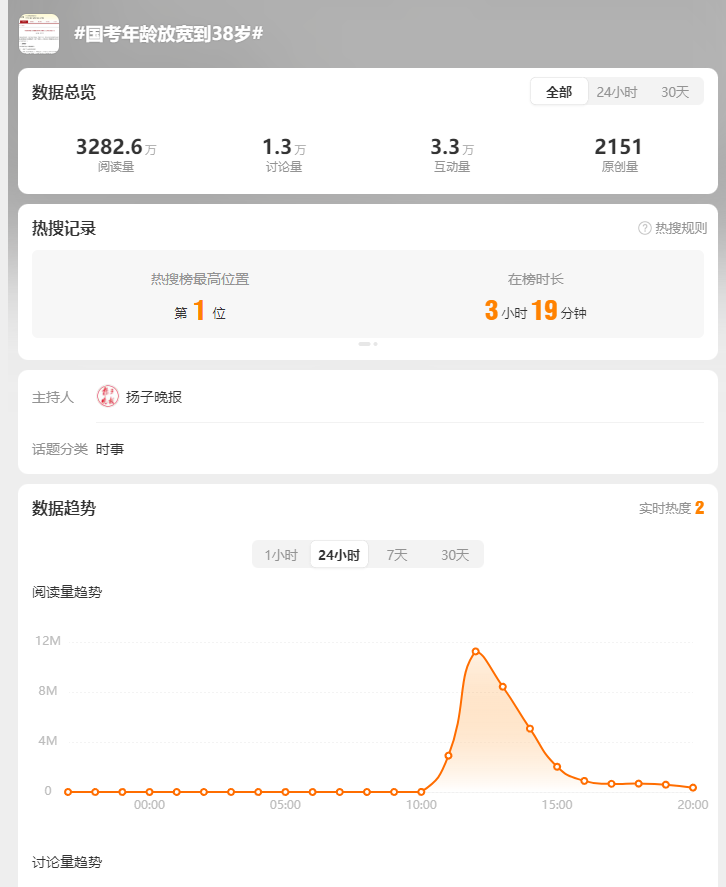 隨后,該公告內(nèi)容被新華社、北京日?qǐng)?bào)、揚(yáng)子晚報(bào)、極目新聞等多家媒體報(bào)道,迅速引發(fā)輿論關(guān)注。微博話題“#國(guó)考年齡放寬到38歲#”迅速登上熱搜榜最高位置。