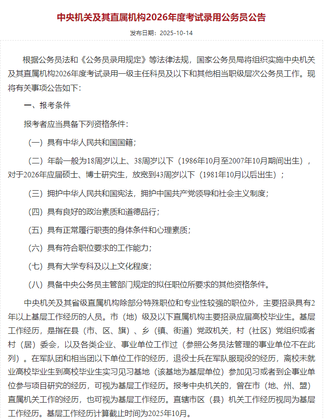 10月14日,國(guó)家公務(wù)員局網(wǎng)站發(fā)布《中央機(jī)關(guān)及其直屬機(jī)構(gòu)2026年度考試錄用公務(wù)員公告》,公告顯示報(bào)考條件:年齡一般為18周歲以上、38周歲以下(1986年10月至2007年10月期間出生),對(duì)于2026年應(yīng)屆碩士、博士研究生,放寬到43周歲以下(1981年10月以后出生)。這意味著,國(guó)家公務(wù)員報(bào)考者年齡放寬至38周歲以下,打破過(guò)去35周歲上限。此外,對(duì)于應(yīng)屆生碩士、博士研究生,年齡更是放寬至43周歲以下。