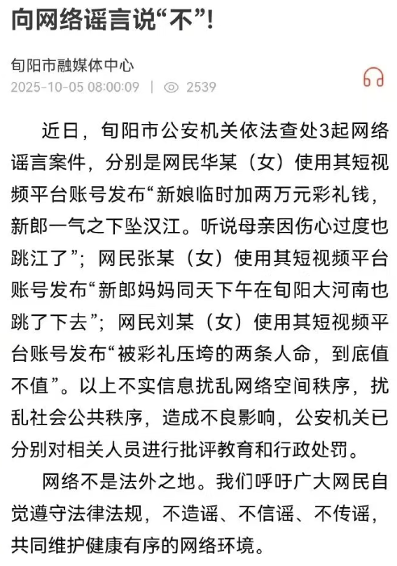 10月5日,旬陽市融媒體中心發(fā)布消息稱,近日,旬陽市公安機(jī)關(guān)依法查處3起網(wǎng)絡(luò)謠言案件,三名網(wǎng)民使用短視頻平臺賬號發(fā)布“新郎婚禮前跳河”事件不實(shí)信息,擾亂網(wǎng)絡(luò)空間秩序和社會公共秩序,造成不良影響,公安機(jī)關(guān)已分別對相關(guān)人員進(jìn)行批評教育和行政處罰。隨后,中國新聞社、觀察者網(wǎng)、《法治日報(bào)》等媒體轉(zhuǎn)發(fā)報(bào)道。此次回應(yīng)雖引發(fā)了輿論對網(wǎng)絡(luò)謠言的深思,但仍未能驅(qū)散公眾心頭的疑云。紅網(wǎng)評論道,官方調(diào)查需要時(shí)間,而信息真空期恰恰為謠言的滋生提供了土壤。紅星新聞評論認(rèn)為,無論原因?yàn)楹?,都令人痛心。此時(shí),理性的圍觀和善意的等待,遠(yuǎn)比迫不及待的“斷案”更有價(jià)值。我們應(yīng)該給予足夠的尊重和空間,等待權(quán)威的、詳盡的調(diào)查結(jié)果。《新京報(bào)》評論指出,這起新郎跳河事件具備足夠的公共性,有必要把事件的前因后果說得更清楚明白一些。否則,各種傳言甚至謠言紛紛而起,不利于網(wǎng)絡(luò)空間和社會秩序的維護(hù)。多數(shù)網(wǎng)民也持相同觀點(diǎn),認(rèn)為“掩蓋必然引發(fā)猜測”,并持續(xù)追問事件真相,呼吁官方給出更具說服力的詳實(shí)通報(bào)。