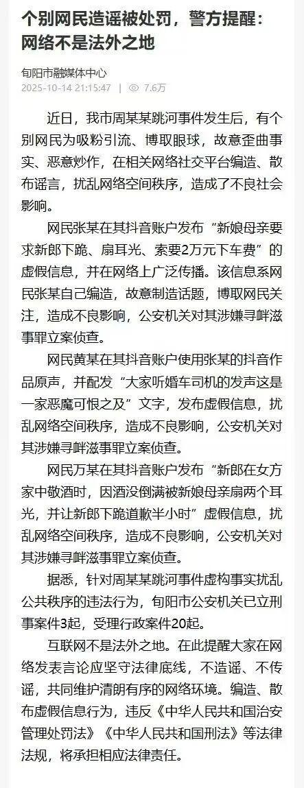 同日,陜西安康旬陽市融媒體中心發(fā)布消息稱,近日,旬陽市周某某跳河事件發(fā)生后,有個(gè)別網(wǎng)民為吸粉引流、博取眼球,故意歪曲事實(shí)、惡意炒作,在相關(guān)網(wǎng)絡(luò)社交平臺編造、散布謠言,擾亂網(wǎng)絡(luò)空間秩序,造成了不良社會影響。網(wǎng)民張某、黃某、萬某在短視頻賬戶發(fā)布相關(guān)虛假信息,造成不良影響,已被公安機(jī)關(guān)以涉嫌尋釁滋事罪立案偵查。針對周某某跳河事件虛構(gòu)事實(shí)擾亂公共秩序的違法行為,旬陽市公安機(jī)關(guān)已立刑事案件3起,受理行政案件20起。輿論普遍表示,官方展現(xiàn)了治理謠言的決心,認(rèn)為制止謠言最好的方法就是公布調(diào)查結(jié)果。