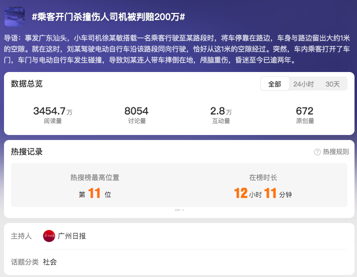 此案被報道后,環(huán)球網(wǎng)、上觀新聞、《廣州日報》等媒體接力傳播,推高輿情熱度,微博話題“#乘客開門殺撞傷人司機被判賠200萬#”登上熱搜榜第11位。