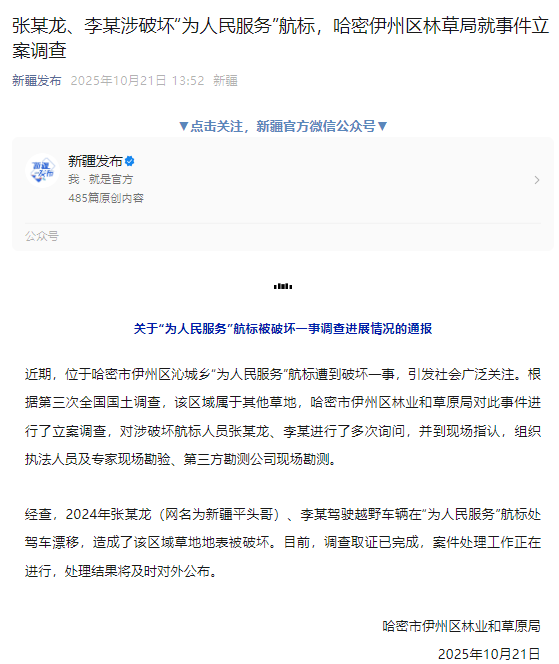 10月21日,新疆維吾爾自治區(qū)新聞辦公室官方微信號(hào)“新疆發(fā)布”發(fā)布通報(bào),稱哈密市伊州區(qū)林業(yè)和草原局對(duì)此事件進(jìn)行了立案調(diào)查,對(duì)涉破壞航標(biāo)人員張某龍(網(wǎng)名為“新疆平頭哥”)、李某進(jìn)行了多次詢問,并到現(xiàn)場(chǎng)指認(rèn)處理結(jié)果將及時(shí)對(duì)外公布。人民日?qǐng)?bào)、澎湃新聞、紅星新聞等轉(zhuǎn)發(fā)了通報(bào)內(nèi)容,輿情有所回溫。