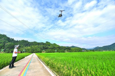 在浙江省杭州市臨安區(qū)太陽(yáng)鎮(zhèn)的稻田內(nèi),90后新農(nóng)人余岳峰操作農(nóng)用無(wú)人機(jī)在田間作業(yè)。 新華社發(fā)