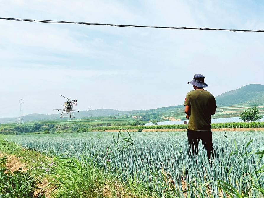 潞城大蔥種植基地,專業(yè)人員操作無(wú)人機(jī)進(jìn)行殺蟲藥噴灑工作