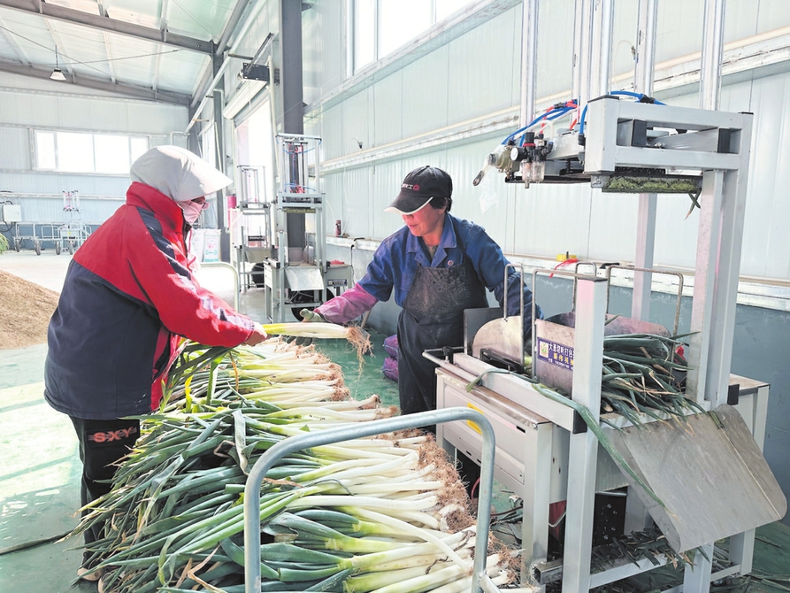 山西云巖山生態(tài)農(nóng)業(yè)有限公司的大蔥加工車間,工人們正在用氣槍吹掉“毛蔥”上的泥土