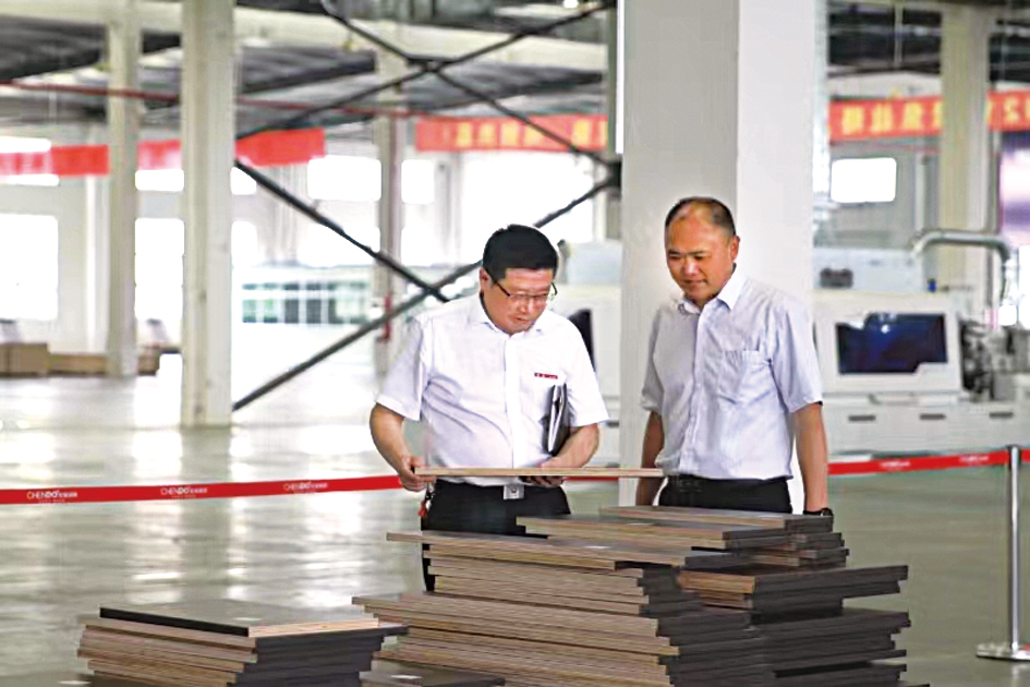 江蘇沭陽農(nóng)商銀行董事長陳雷(左)深入板材企業(yè)走訪調(diào)研