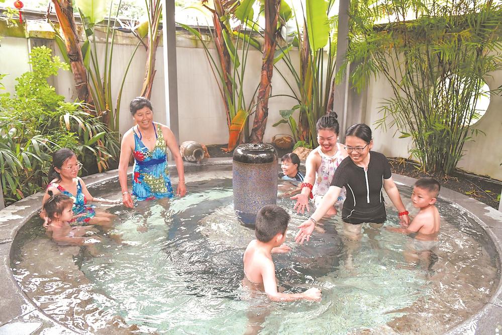 雨季讓廈門今年的初夏顯得格外涼爽。剛剛過去的周末,位于福建省廈門市同安區(qū)汀溪鎮(zhèn)隘頭村坤澤洋自然村的九八號民宿里,前來享受“泡湯”之樂的市民不在少數(shù)——草木之間,天然石塊砌成的暖池錯落有致,溫泉潺潺淌入池里,大人沐浴著泉水悠閑寒暄,孩童則歡快地嬉水玩鬧……