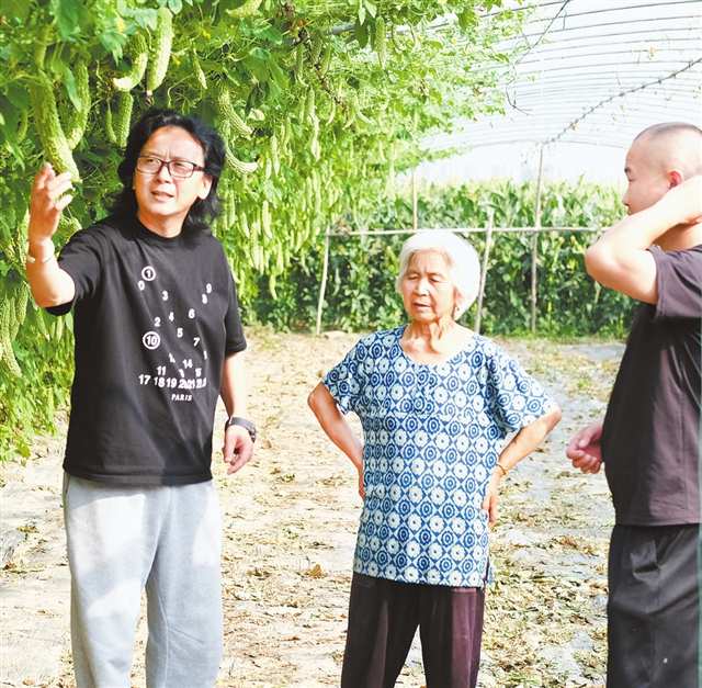 經(jīng)營民宿多年的劉曉波(左一)與潼南區(qū)小舟村村民查看蔬菜生長情況(受訪者供圖)