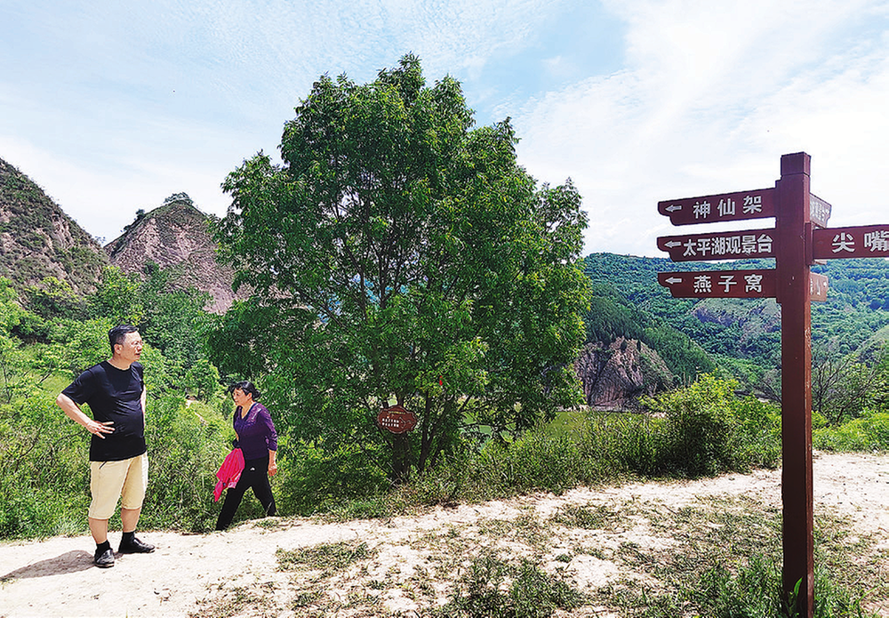 “村里真熱鬧,咋這么多人?”“咱村村民不多,就300多人,其余都是城里來(lái)的人,來(lái)這兒看燕子窩、太平湖、尖嘴山、夫妻崖的?!?/p>