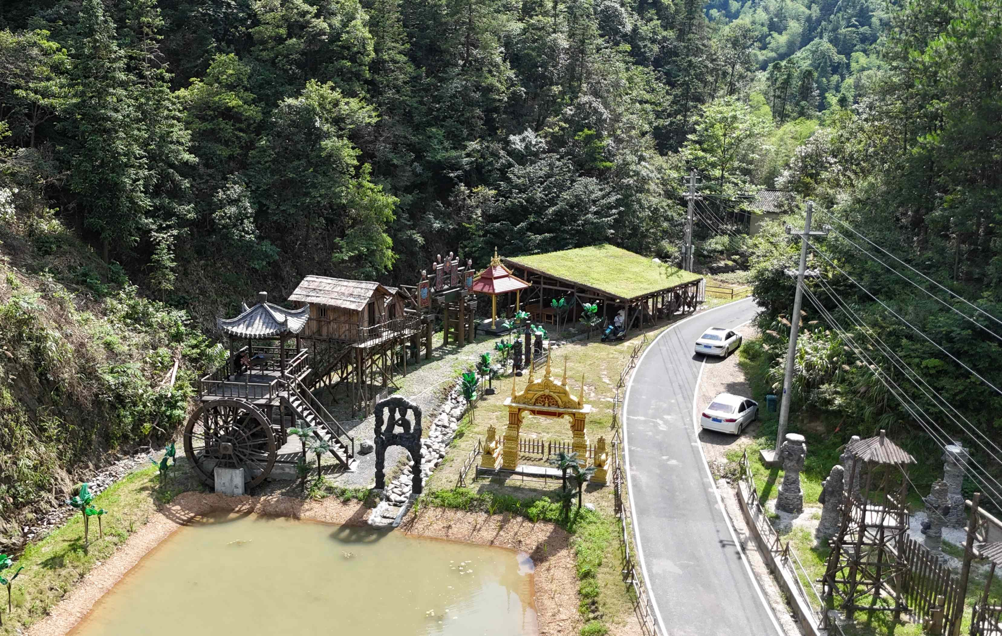 走進(jìn)紅光村的方坑嶺強(qiáng)鄉(xiāng)富村影視基地,東南亞風(fēng)格建筑和古代宮廷場(chǎng)景仿佛讓人穿越。在這里,不到一年的時(shí)間已經(jīng)拍了4部電影和8部短劇,小山村儼然成了“劇工廠”。