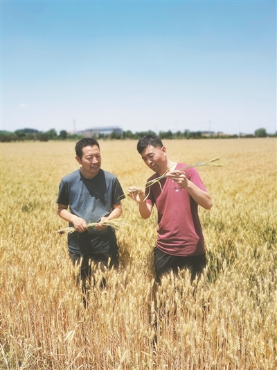 農(nóng)民正高級農(nóng)藝師張付寶(右)在觀察莊稼長勢