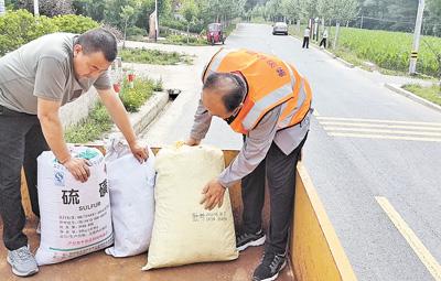 麟游縣農(nóng)村公路發(fā)展服務(wù)中心養(yǎng)護工(右)在幫助群眾裝糧食楊雅芳 攝