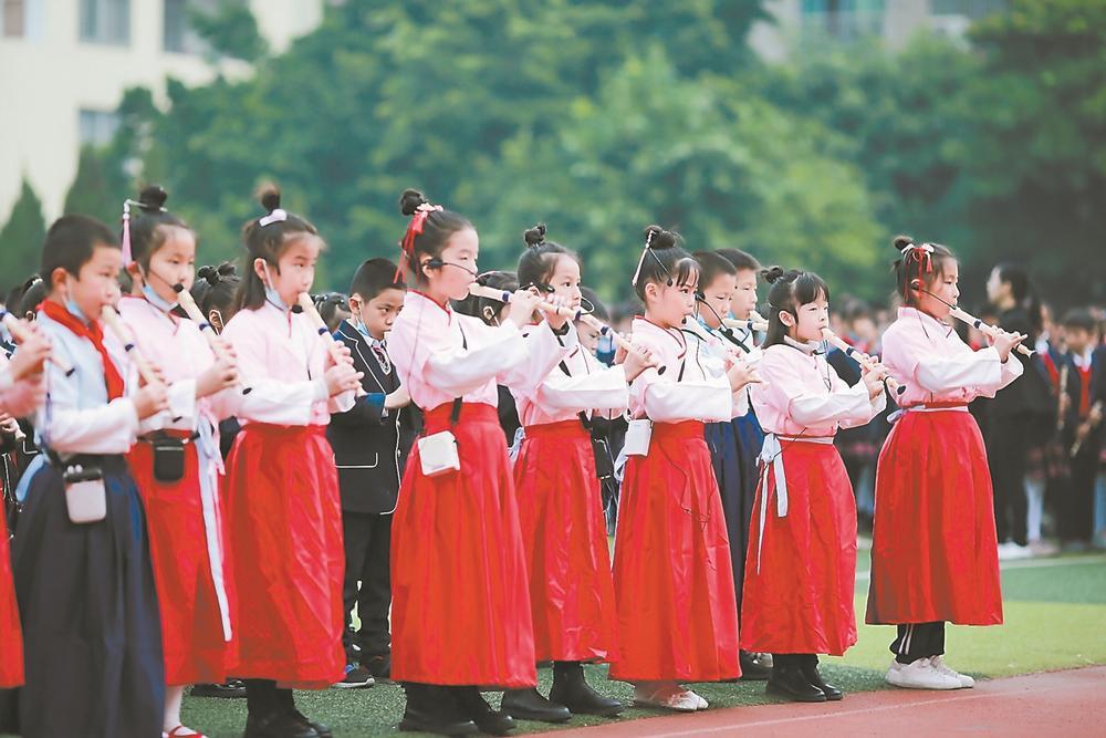 “伡鼓隊(duì)籌備4個月了,目前教師隊(duì)伍已由鄉(xiāng)土音樂專家培訓(xùn)并出師,基礎(chǔ)教材也編寫完畢,下學(xué)期就可以呈現(xiàn)在音樂課堂上?!逼翁锏谑袑W(xué)音樂組教師郭劍光說。