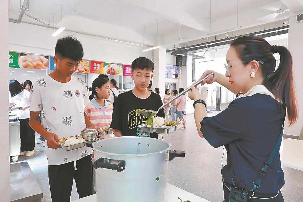 為了讓學生吃飽吃好,學校食堂請來了掌勺多年的師傅?!昂_呴L大的孩子在家吃多了海鮮,我們會多做肉類菜品,午餐晚餐保證兩葷兩素一湯,能做到兩周內(nèi)食材不重復,一個月內(nèi)讓學生吃上超過30種不同食材,確保營養(yǎng)均衡?!秉S韶輝說。