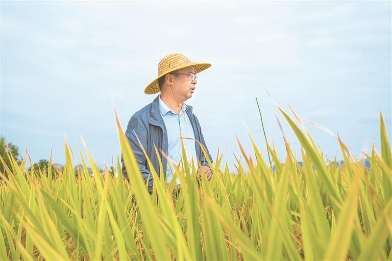 貴陽市鄉(xiāng)村振興服務(wù)中心品牌站站長、正高級農(nóng)藝師張斌在龍寶大壩查看水稻收成情況