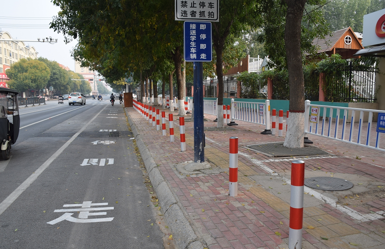 “N”即各學(xué)校的個性化改進措施。在莘縣實驗幼兒園門口,以往接送孩子的車輛往往存在著無序停放問題,一到上下學(xué)高峰時段,人流車流很容易發(fā)生擁堵情況,也存在較大安全隱患。除了實施“12345”舉措,莘縣交警將幼兒園門口東路沿石以上的區(qū)域,劃分為家長等候區(qū)和接送通道,家長等候區(qū)使用間距1.5米的防撞隔離樁封閉,汽車不能進入,電動自行車可以進入等待,有效解決了這些問題。
