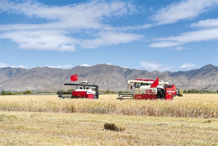 日喀則市白朗縣巴扎鄉(xiāng)農(nóng)機合作社的村民進行機械化收割(資料圖片)記者 李洲 攝