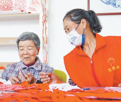 日照市嵐山區(qū)虎山鎮(zhèn)黃家峪村養(yǎng)老服務(wù)中心內(nèi),志愿者在陪老人剪紙 新華社記者 郭緒雷 攝