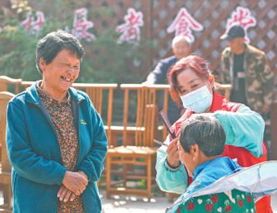 淄博市博山區(qū)池上鎮(zhèn)池埠村長(zhǎng)者食堂里,志愿者在為老人理發(fā) 新華社記者 朱崢 攝