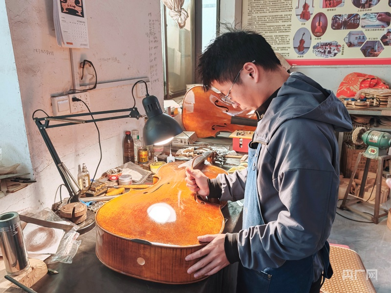 確山縣手工提琴制作協(xié)會會長王金堂見證了家鄉(xiāng)提琴產(chǎn)業(yè)從無到有、從弱到強的全過程。2015年,他率先返鄉(xiāng)創(chuàng)立河南省金鳴樂器股份有限公司,并帶領(lǐng)一批制琴師回到確山創(chuàng)業(yè)。他們通過改進(jìn)工藝、研發(fā)新品,將確山提琴打造成國際高端市場的寵兒。王金堂介紹,他的一把定制手工提琴曾以20萬美元的價格賣出。