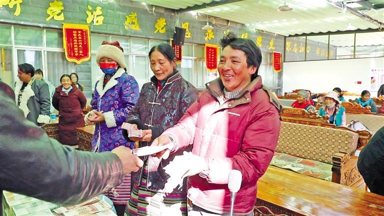 冬日的阿里,寒氣襲人,然而在獅泉河鎮(zhèn)加木村的黨員活動室里,卻是暖意融融、熱鬧非凡。原來,這里正在召開村里的年終分紅大會。村合作社經(jīng)理洛桑達瓦首先向群眾介紹了合作社2024年的運營及收益情況,隨后按村民入股多少逐戶發(fā)放分紅款??粗掷锏摹罢娼鸢足y”,村民們個個笑得合不攏嘴。