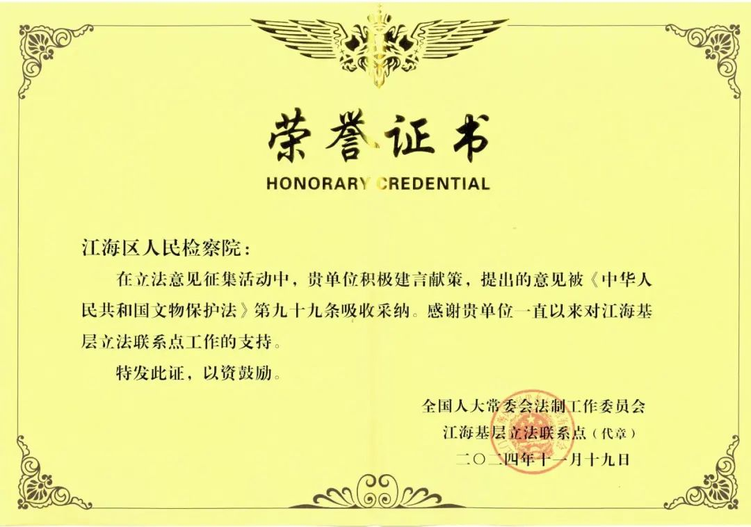 助力“法務(wù)集聚區(qū)”建設(shè),落實(shí)“誰執(zhí)法,誰普法”責(zé)任制,開展法律“六進(jìn)”活動60余次。積極履行立法聯(lián)系單位職責(zé),對4部法律修訂草案提出立法建議,其中對文物保護(hù)法提出的意見被全國人大常委會法制工作委員會吸收采納。