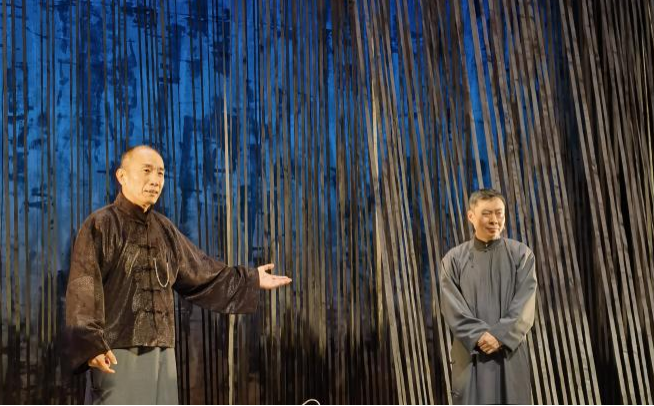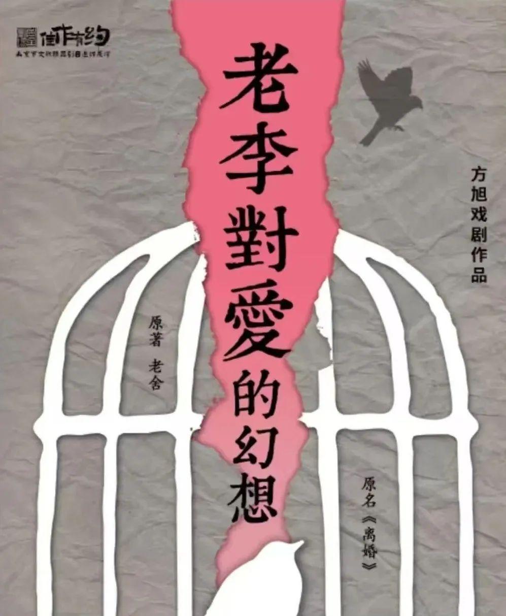 2025年3月末,由方旭、郭笑主演的話劇《老李對愛的幻想》在北京老舍劇場成功展演。該劇改編自老舍同名長篇小說《離婚》,講述主人公小“智識”分子老李掙扎于詩意幻想和庸俗實(shí)際,在傳統(tǒng)和變革進(jìn)退兩難的苦悶中,經(jīng)由一起“政治”暗殺促成自我蛻變的無奈故事。劇中著力表現(xiàn)民國離婚鬧劇風(fēng)潮下,小市民的情感困境及文化心態(tài),正如老李的舞臺形象:一身灰色長衫,圍著藍(lán)色圍巾——灰藍(lán)色在老舍筆下是“最不得人心的”,因?yàn)椤耙挥錾详柟夤鼙V皇O禄?,一點(diǎn)也不藍(lán)”。