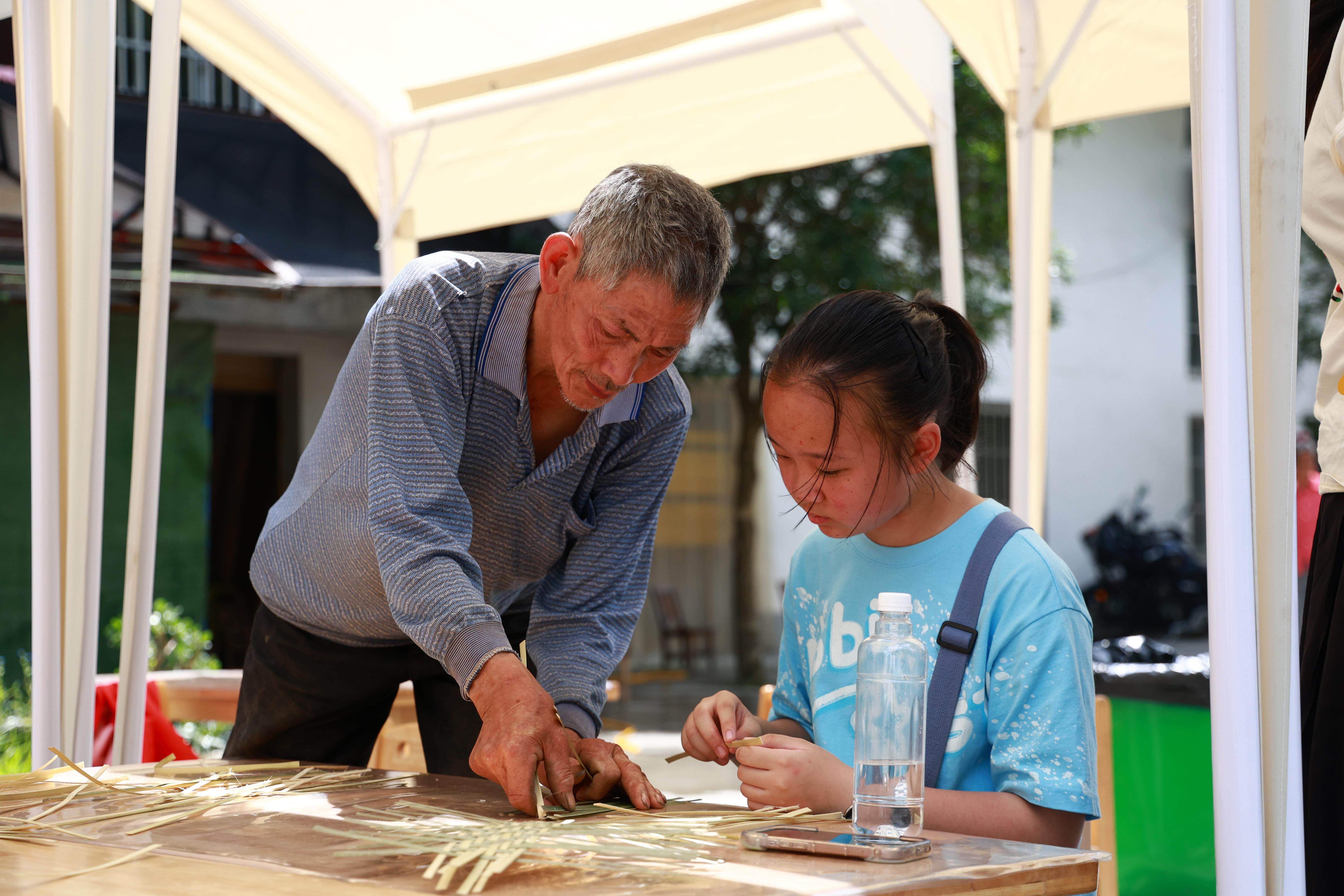 村傳統(tǒng)手藝人王安高指導(dǎo)小朋友編制竹簍 何丹 攝