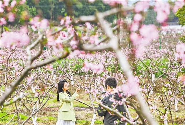 銅梁區(qū)圍龍鎮(zhèn)龍湖村水蜜桃基地,桃花盛開(kāi)吸引游客拍照留影(攝于3月21日)。記者 龍帆 攝