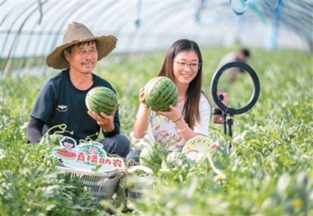浙江省湖州市長興縣濱湖村,年輕志愿者和瓜農(nóng)一起直播銷售今年首批大棚西瓜。譚云俸 攝