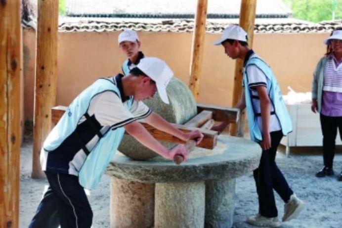 神玉村的名氣越來(lái)越響,許多研學(xué)團(tuán)也紛至沓來(lái)。記者到訪時(shí),180多名黃龍縣初級(jí)中學(xué)初二的學(xué)生正在神玉村開展研學(xué)活動(dòng),他們動(dòng)手磨豆?jié){、包餛飩、生火做飯,感悟“一粥一飯,當(dāng)思來(lái)之不易”的道理。