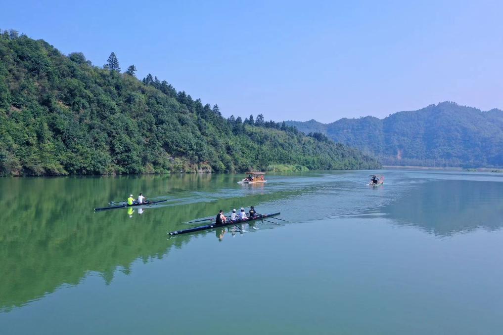 游客在平垣秘境景區(qū)內(nèi),體驗(yàn)賽艇、木筏漂流等項(xiàng)目。新華社發(fā)