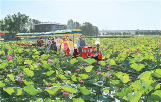 游客在河南焦作黃河龍澤園乘游覽小火車(chē)賞荷。劉金元 攝