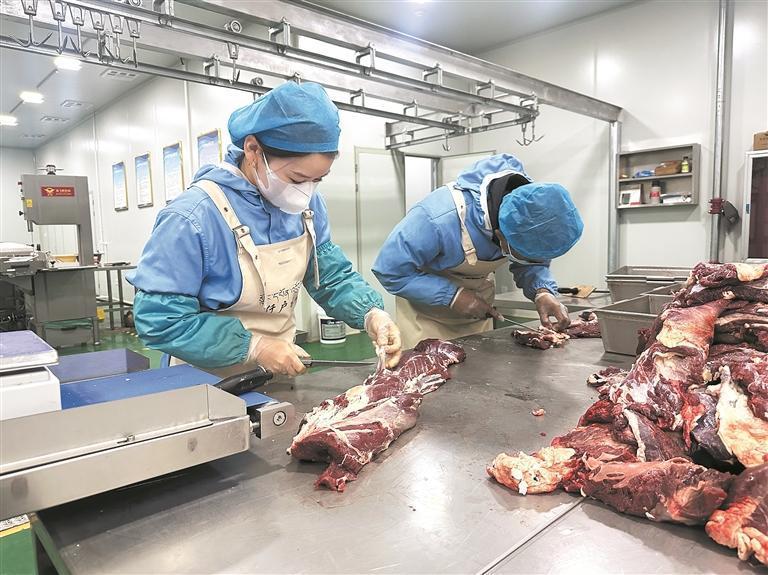 “一只成年藏羊在經過檢疫達標屠宰后,先送至排酸間用保鮮排酸技術進行排酸,再被送進這里分割加工、剔骨、修割。”仟戶牧場加工車間工作人員馬玉梅介紹說。只見她手持專用刀具,沿著羊肉的肌肉紋理精準下刀,將藏羊按部位分割成精品羊肋排、羊腿肉(帶骨)、羊脖片等不同區(qū)塊。隨后,新鮮的藏羊肉被快速分揀至不同區(qū)域,有的進入真空包裝機完成封裝,有的則被送往進一步加工的流水線。車間里機器運轉的低鳴聲與工作人員專注的動作交織,每一個環(huán)節(jié)都嚴格遵循衛(wèi)生標準,確保肉類從分割到成品的全程安全。