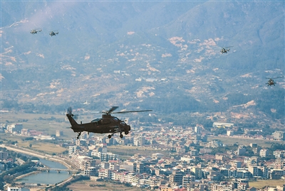 “計時起飛?!鄙衔?時,隨著塔臺指揮員一聲令下,30余架多型號直升機從閩南某機場騰空而起,直奔預定空域,拉開訓練帷幕。
