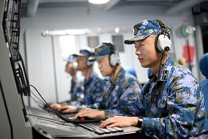 5月2日,中國海軍第35批護(hù)航編隊官兵在操控臺上發(fā)出指令。江山 攝