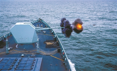 “戰(zhàn)斗警報!”編隊剛剛抵達訓(xùn)練海域,便遭遇“敵”海上目標?!澳繕朔€(wěn)定跟蹤,請示開火!”廈門艦主炮兵岳昊大聲報告?!伴_火!”指揮員果斷下令,炮彈呼嘯而出……