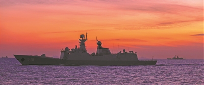 圖為夜幕降臨,艦艇編隊逐浪前行。