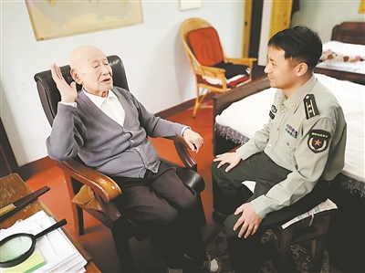 上圖為紀(jì)曉飛(右)傾聽老干部講述戰(zhàn)斗故事。徐文靜 攝